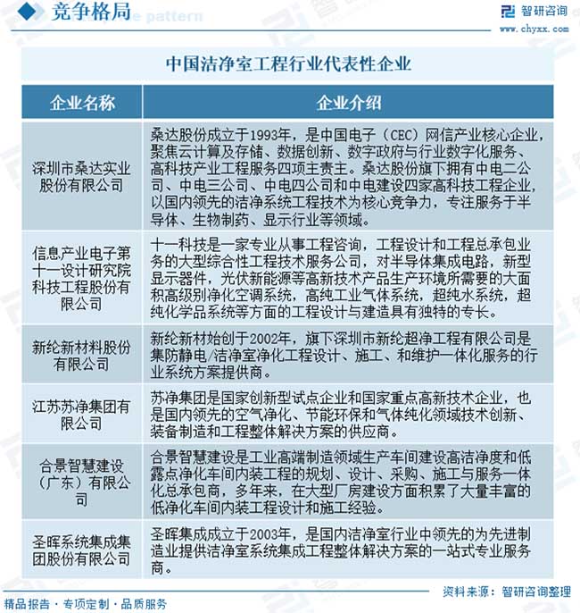 超潔凈環(huán)境控制又融合了風險評估、生產(chǎn)認證的概念和程序,加之潔凈技術跨行業(yè)、跨專業(yè)、跨學科的特點,使得潔凈室工程的難度和復雜性增加。因此對于潔凈室工程行業(yè)來說,優(yōu)化設計、現(xiàn)場施工環(huán)境的協(xié)調與管控、工程相關技術細節(jié)的經(jīng)驗積累,對客戶需求的理解和實現(xiàn),以及對設計變更的準備和響應程度等都是衡量潔凈室工程企業(yè)競爭能力的重要指標。?目前,我國潔凈室工程行業(yè)競爭較為激烈,企業(yè)數(shù)量較多。其中,桑達股份、十一科技、蘇凈集團、新綸新材、柏誠股份、亞翔集成等設計研究院或建設承包企業(yè)在降低建造成本、提高潔凈室的穩(wěn)定性等方面占據(jù)優(yōu)勢,能提供高端潔凈室系統(tǒng)集成解決方案,位居行業(yè)領先地位。同時,行業(yè)內還存在大量規(guī)模較小、技術水平與綜合解決方案能力有限的潔凈室工程企業(yè),普遍集中在對潔凈等級要求不高的低端市場。